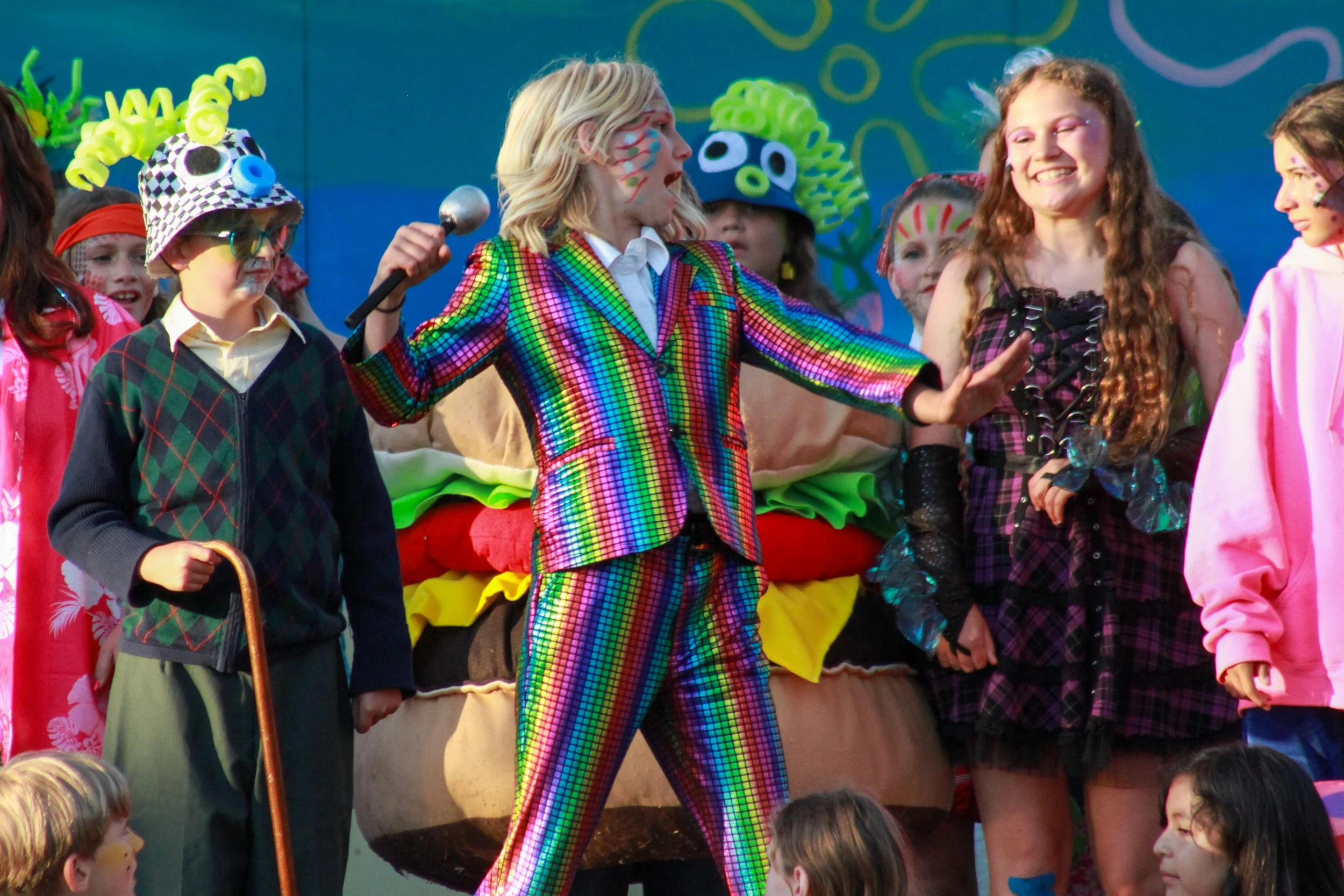 An actor in the show Sponge Bob, in a colorful, rainbow checkered suit on stage holding a microphone, surrounded by children dressed in various costumes with face paint, as part of a theatrical or entertainment performance.